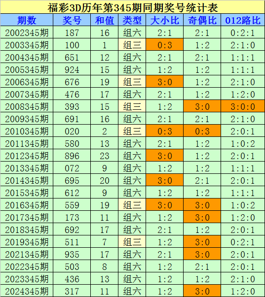 组选类型判断:在第345期历史同期开奖中,组六开出16次,组三开出6次,今年同期看好开出组六号码。